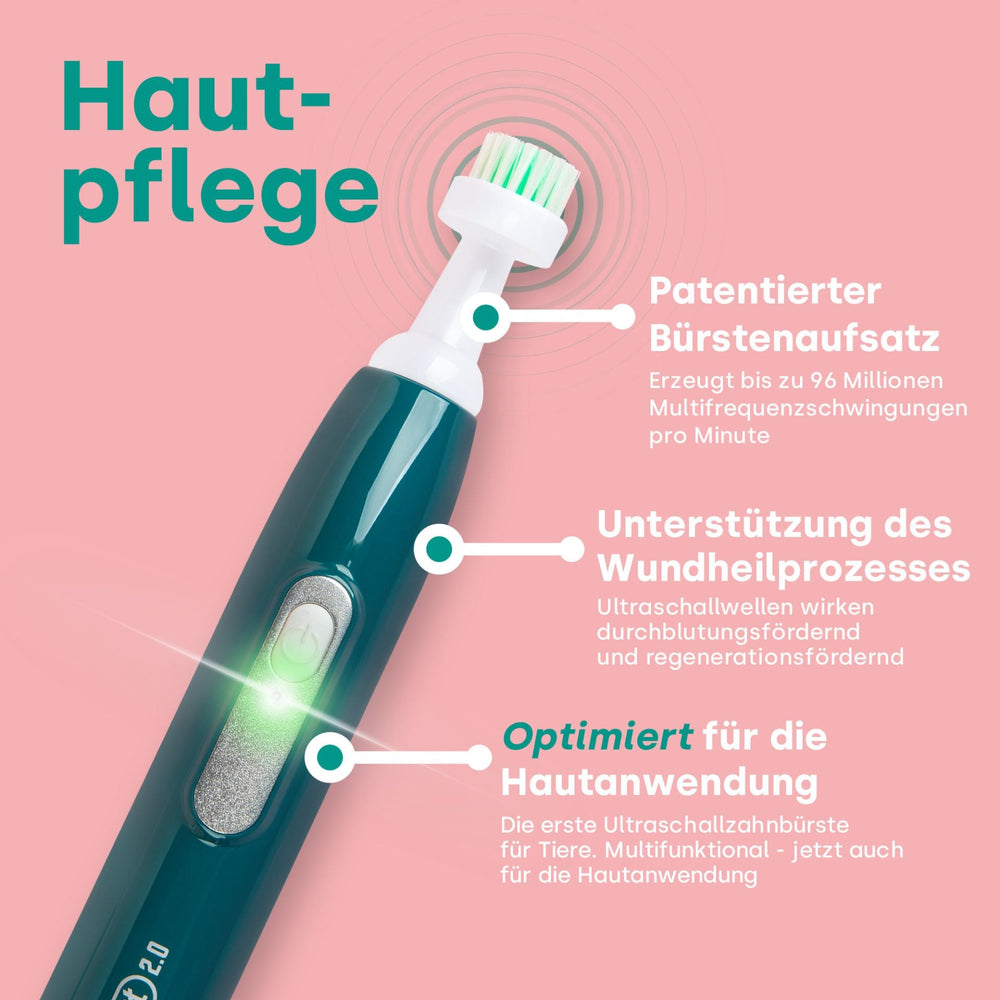 • Der Ultraschall wird durch die Taktungsrate an die zu behandelnde Stelle (Haut/Fell oder Zähne) befördert. Durch die Erhöhung der Taktungsrate wird der Ultraschall demnach gleichmäßiger an die betroffende Stelle befördert. Dies führt im Umkehrschluss zu einem verbesserten Reinigungsergebnis und macht das Upgrade auf das emmi-pet Hautpflege-Set 2.0 so wirkungsvoll.