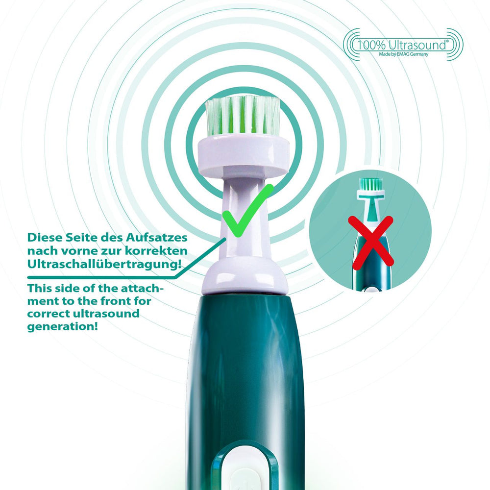 • emmi-pet Care Ultraschallaufsatz auf das emmi-pet Handteil aufsetzen, mit Wasser anfeuchten und das eingeschaltete Gerät draufhalten