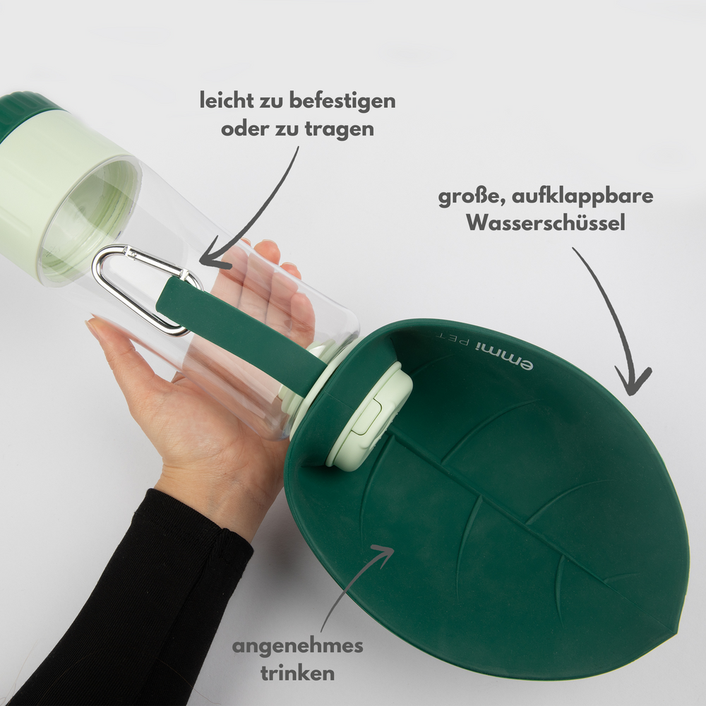 Bei Anstrengung oder Hitze brauchen Hunde besonders viel Wasser. Auf Reisen oder beim Spaziergang ist es manchmal nicht leicht, den Vierbeiner mit frischem Wasser zu versorgen. Unterwegs ist es dann nicht verwunderlich, wenn das Tier Durst bekommt und aus Pfützen oder Tümpeln trinkt. Doch das Wasser kann Krankheitskeime enthalten und zu Verdauungsproblemen führen. Deshalb ist die emmi-pet Hundetrinkflasche die ideale Lösung für unterwegs. Mit der emmi-pet Hundetrinkflasche 2in1 hast du immer reichlich Wasser parat. Durch einfaches Umklappen des Blattes verwandelt sich die Haustiertrinkflasche augenblicklich in eine praktische Wasserschüssel. Mit dem speziellen Druckdesign kannst du mühelos den Wasserfluss kontrollieren oder zurückfließen lassen. Der dazugehörige Futterbehälter bietet Platz für Leckerlies oder kleine Snacks. Unsere Hundetrinkflasche to go ist mit einem leicht zu tragenden Aluminiumkarabiner ausgestattet und kann problemlos an Tasche oder Fahrrad befestigt werden.