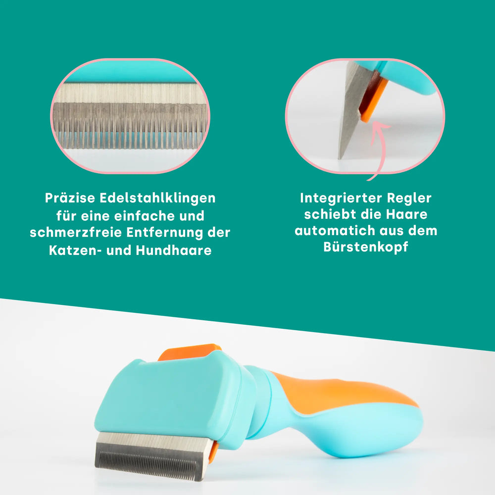 Lose Haare werden einfach mit Hilfe des Druckknopfes ganz bequem aus der Edelstahlkante entfernt - so einfach war Fellpflege noch nie.