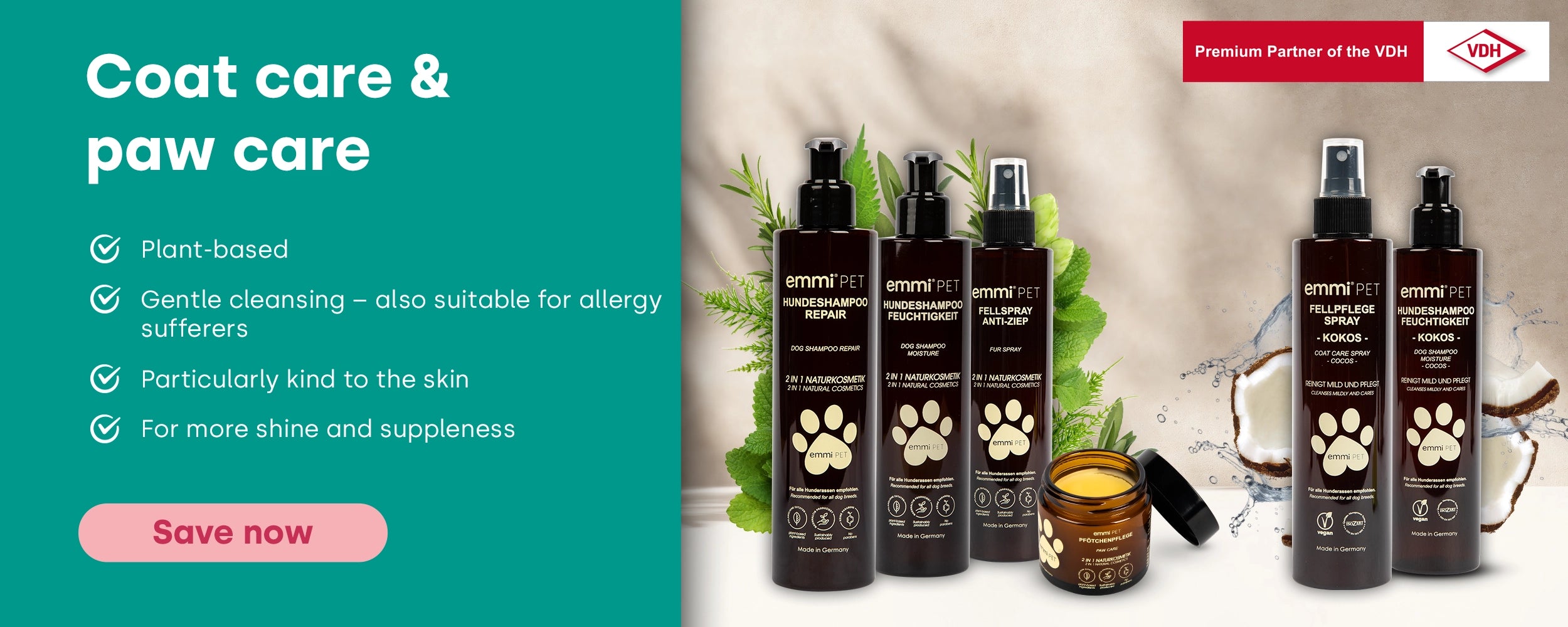 At emmi-pet you will not only find treats and dental care products. We also offer a wide selection of fur care products and dog toys, as well as dog beds.