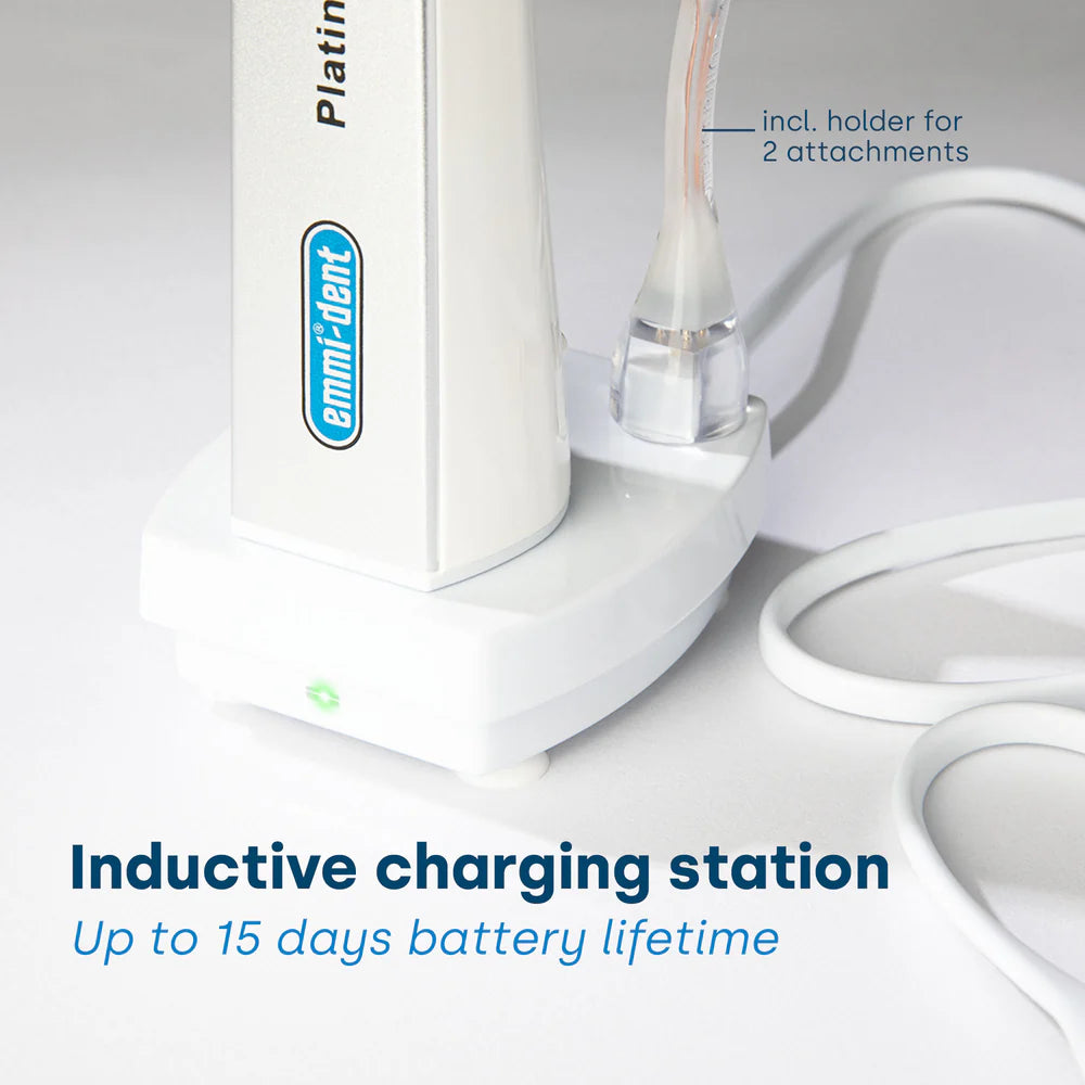 Thanks to the abrasion-free ultrasound technology, the emmi-dent PlatinumCAM is particularly suitable for people with sensitive gums, implants, braces or dental diseases such as periodontitis. The gentle vibrations clean gently without irritating teeth or gums. This keeps your teeth healthy without damaging the tooth enamel.