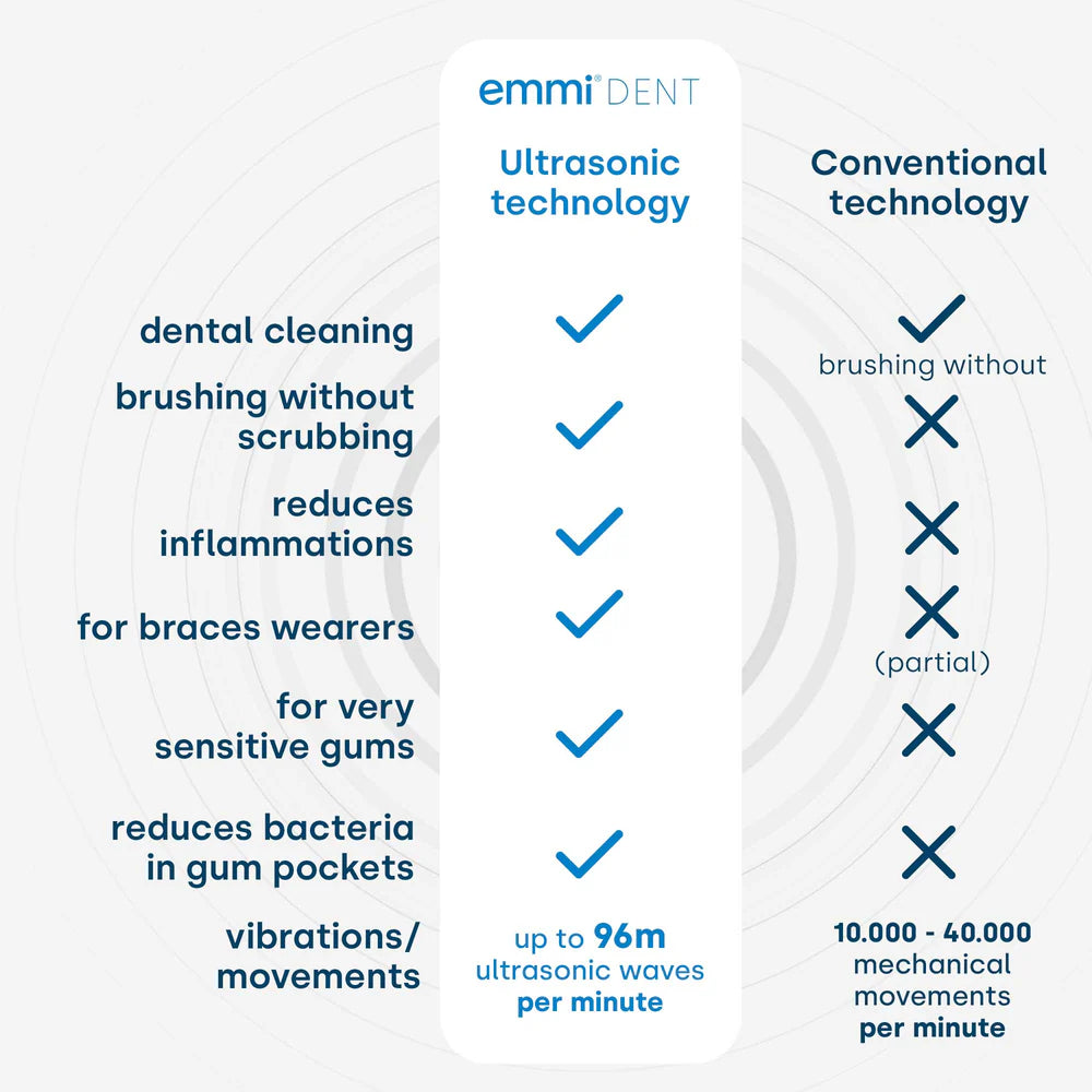 The ultrasonic waves penetrate deep into the spaces between the teeth and the gum line. There they dissolve bacteria and plaque, which effectively prevents tooth decay, gingivitis and other dental diseases. The specially developed emmi-dent ultrasonic toothpaste is used for particularly thorough results. The included microbubbles support the effect of the ultrasound many times over.