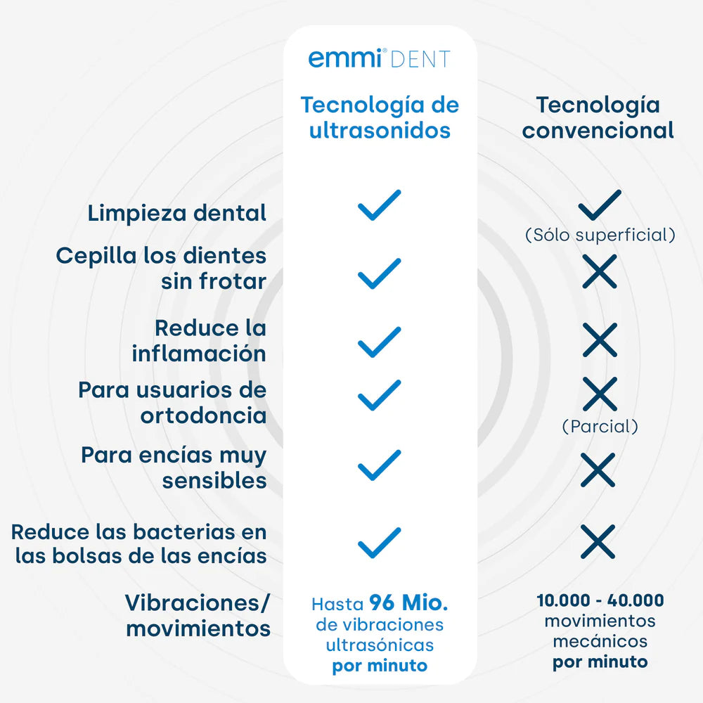Las ondas ultrasónicas penetran profundamente en los espacios entre los dientes y la línea de las encías. Allí disuelven las bacterias y la placa, lo que previene eficazmente la caries, la gingivitis y otras enfermedades dentales. Para obtener resultados especialmente minuciosos se utiliza la pasta de dientes ultrasónica emmi-dent especialmente desarrollada. Las microburbujas incluidas mejoran enormemente el efecto del ultrasonido.