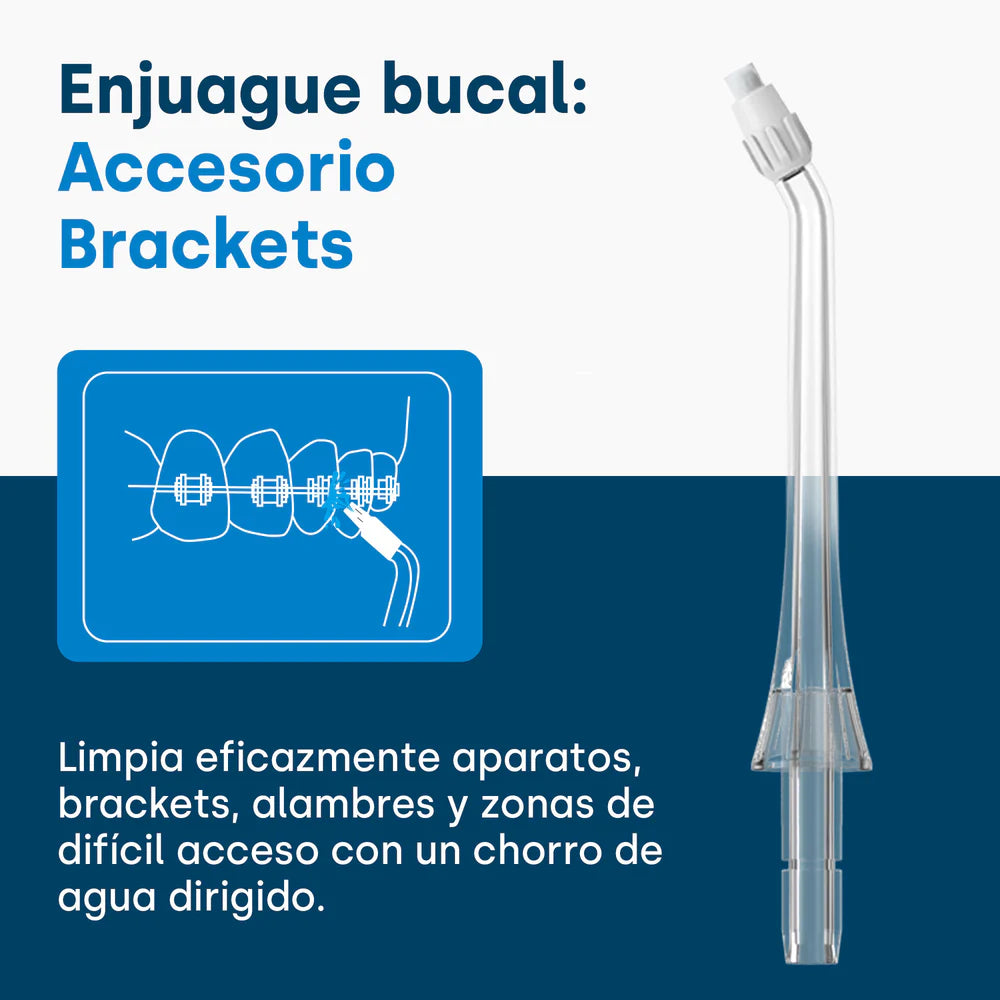 El irrigador bucal es especialmente valioso para personas con aparatos ortopédicos, puentes o implantes. Llega a zonas de difícil acceso y elimina depósitos alrededor de brackets e implantes.