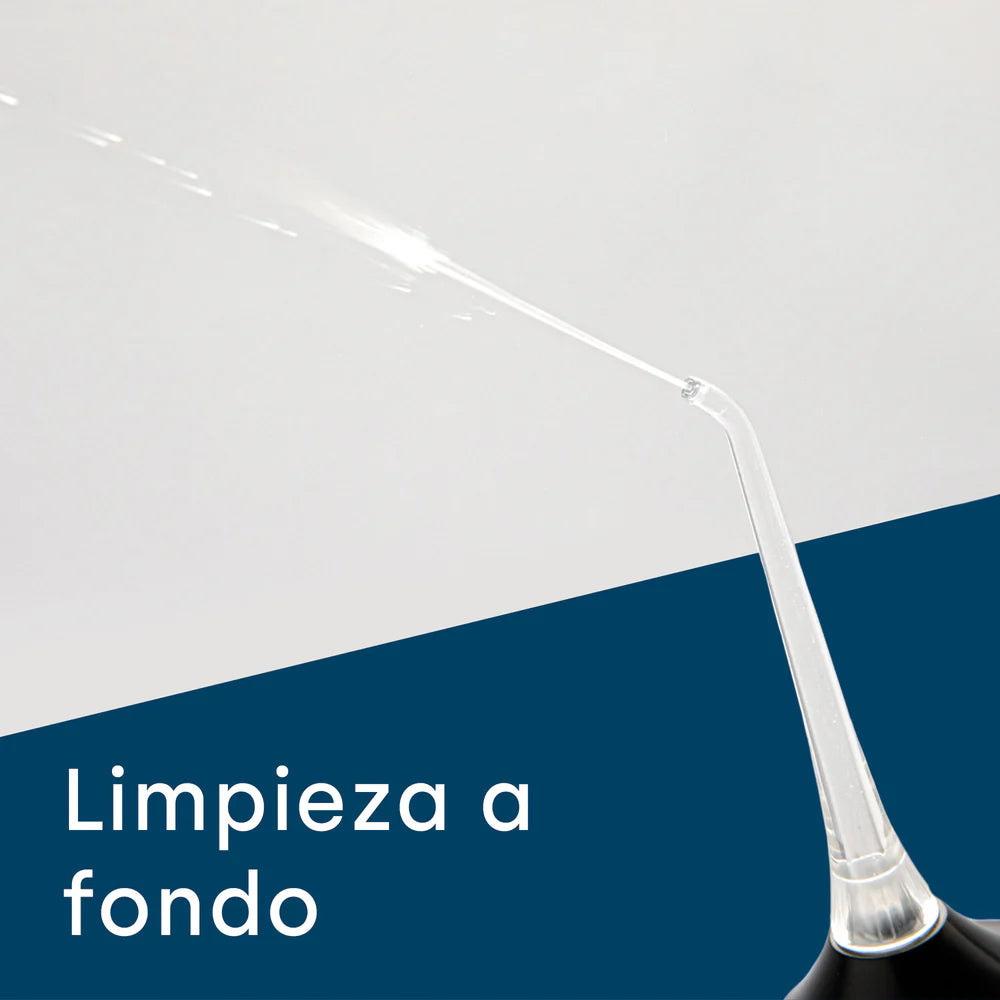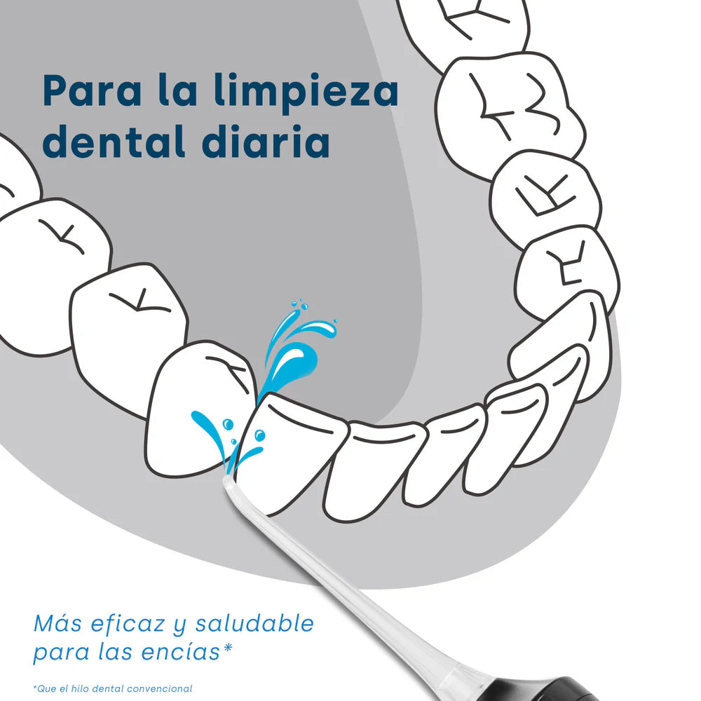 El irrigador bucal es ideal para limpiar de forma profunda y eficaz los espacios entre los dientes donde muchas veces el cepillado convencional no es suficiente. Elimina las partículas de comida y la placa que puedan acumularse allí.
