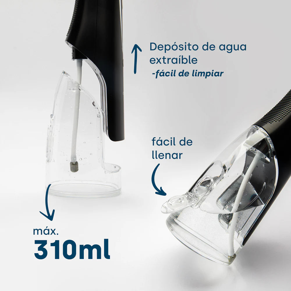 El irrigador bucal es resistente al agua según IPX7 y se puede utilizar en casa o mientras viaja. El depósito integrado de 300 ml se puede extraer fácilmente para su limpieza. La boquilla también se puede quitar fácilmente para cambiar los accesorios.