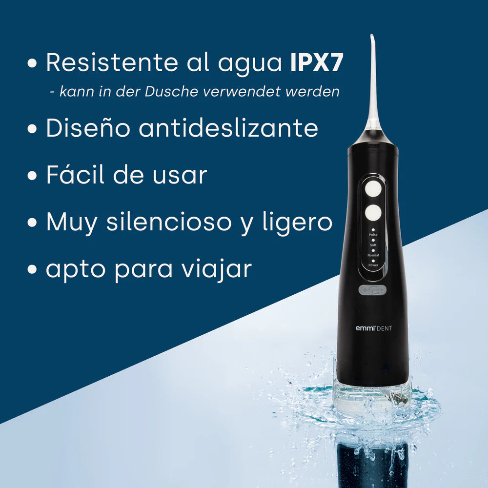 Para limpiar a fondo y de forma eficaz los espacios entre los dientes, a menudo no basta con cepillarse los dientes únicamente. El emmi-dent Desarrollado irrigador bucal. Para protegerse contra problemas de encías, donde los cepillos de dientes convencionales no pueden llegar. En comparación con el hilo dental, emmi-dent Irrigador bucal para una limpieza perfecta incluso con dientes muy juntos o espacios interdentales de difícil acceso. El dispositivo tiene cuatro modos: pulso, suave, normal y fuerte. Con los cuatro accesorios de boquilla incluidos, tendrá la boquilla adecuada para cada tarea de limpieza. Recomendamos reemplazar las boquillas cada 3 meses.