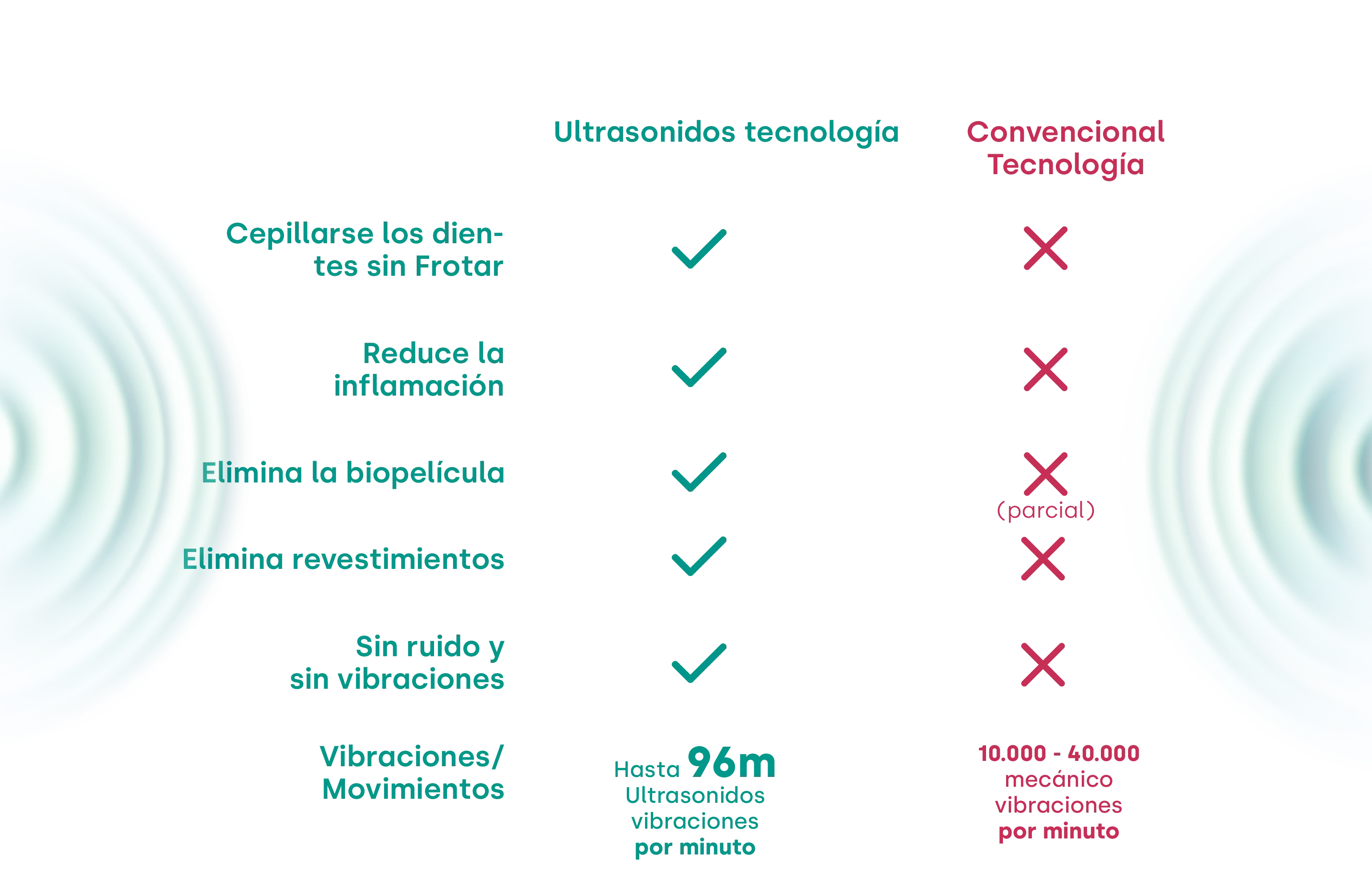 Los cepillos de dientes que funcionan con ultrasonido han revolucionado cepillarse los dientes desde 2013.La ventaja decisiva sobre los cepillos de dientes manuales clásicos o los cepillos de dientes eléctricos es que los cepillos de dientes de ultrasonido funcionan casi no contactos y sin movimientos mecánicos.Esto hace que la limpieza sea particularmente suave y sin embargo confiable.