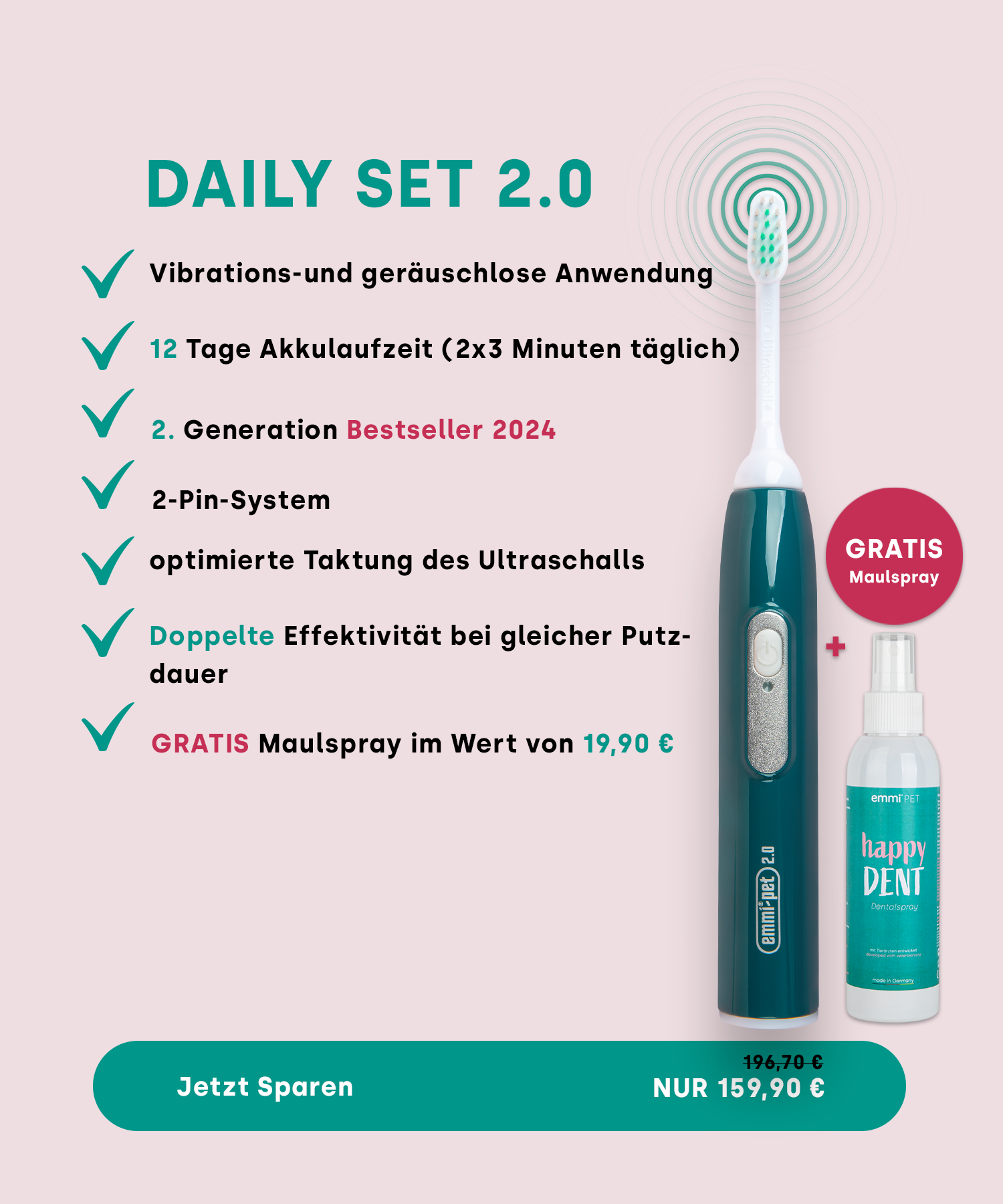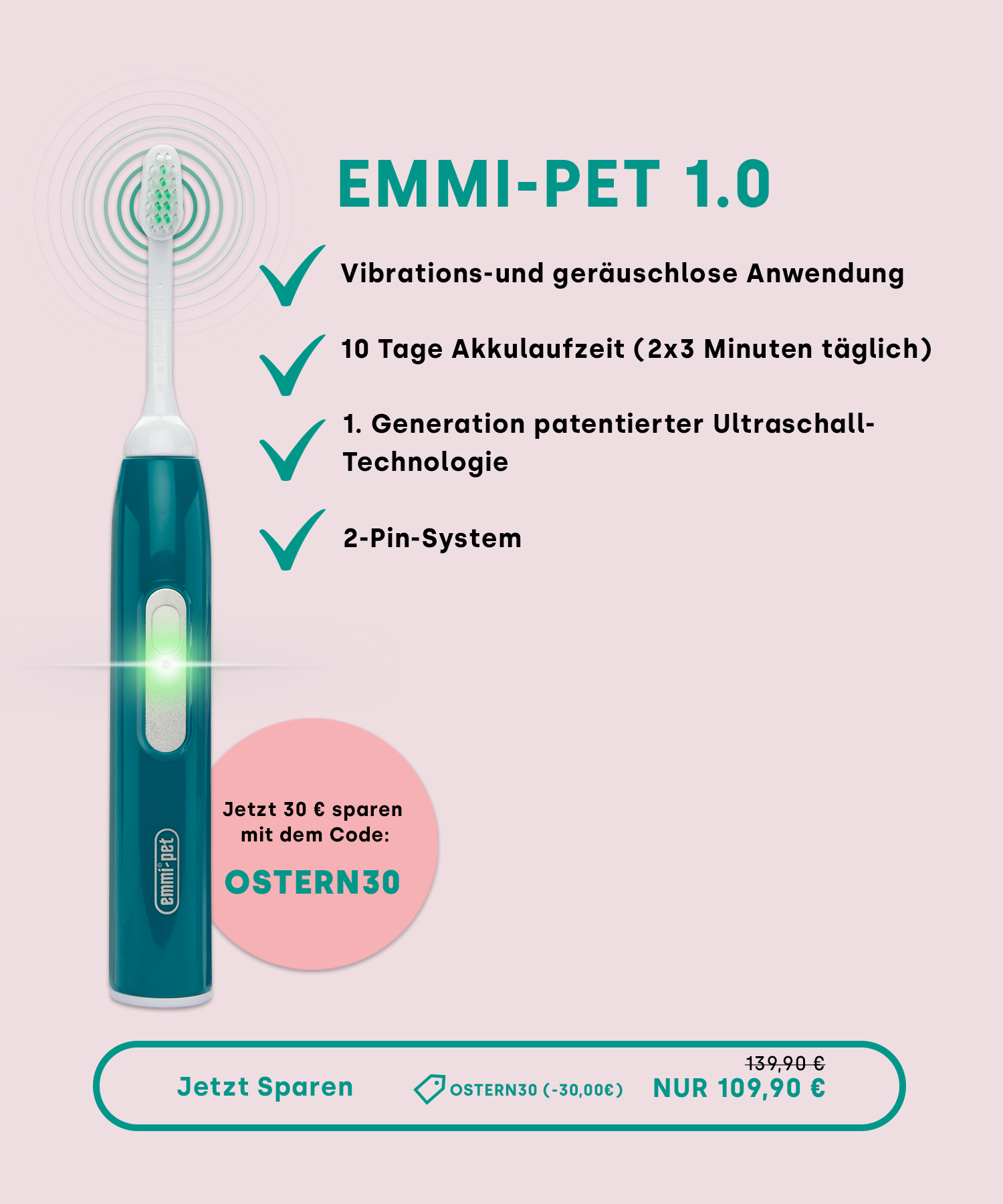 Lo spazzolino ultrasonico emmi-pet rimuove la placca in modo delicato ed efficace, senza strofinare meccanicamente. Con l'aggiunta di uno spray dentale si rallenta la formazione di nuovo tartaro. Una pulizia regolare, inizialmente due o tre volte alla settimana, assicura denti sani e protegge le gengive. Grazie al rinforzo positivo, la cura dei denti diventa rapidamente una routine accettata.