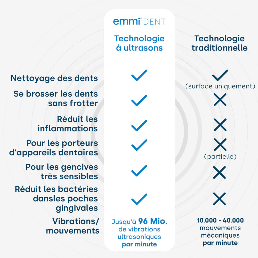 Les ondes ultrasonores pénètrent profondément dans les espaces entre les dents et la gencive. Ils y dissolvent les bactéries et la plaque dentaire, ce qui prévient efficacement la carie dentaire, la gingivite et d'autres maladies dentaires. Pour des résultats particulièrement approfondis, le dentifrice à ultrasons emmi-dent spécialement développé est utilisé. Les microbulles incluses renforcent considérablement l'effet des ultrasons.