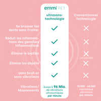 La brosse à dents à ultrasons Emmi Pet est une option douce et silencieuse pour les soins dentaires du chien.Grâce à la technologie des ultrasons, qui génère jusqu'à 96 millions de vibrations par minute, le brossage des dents est possible sans aucun frottement.