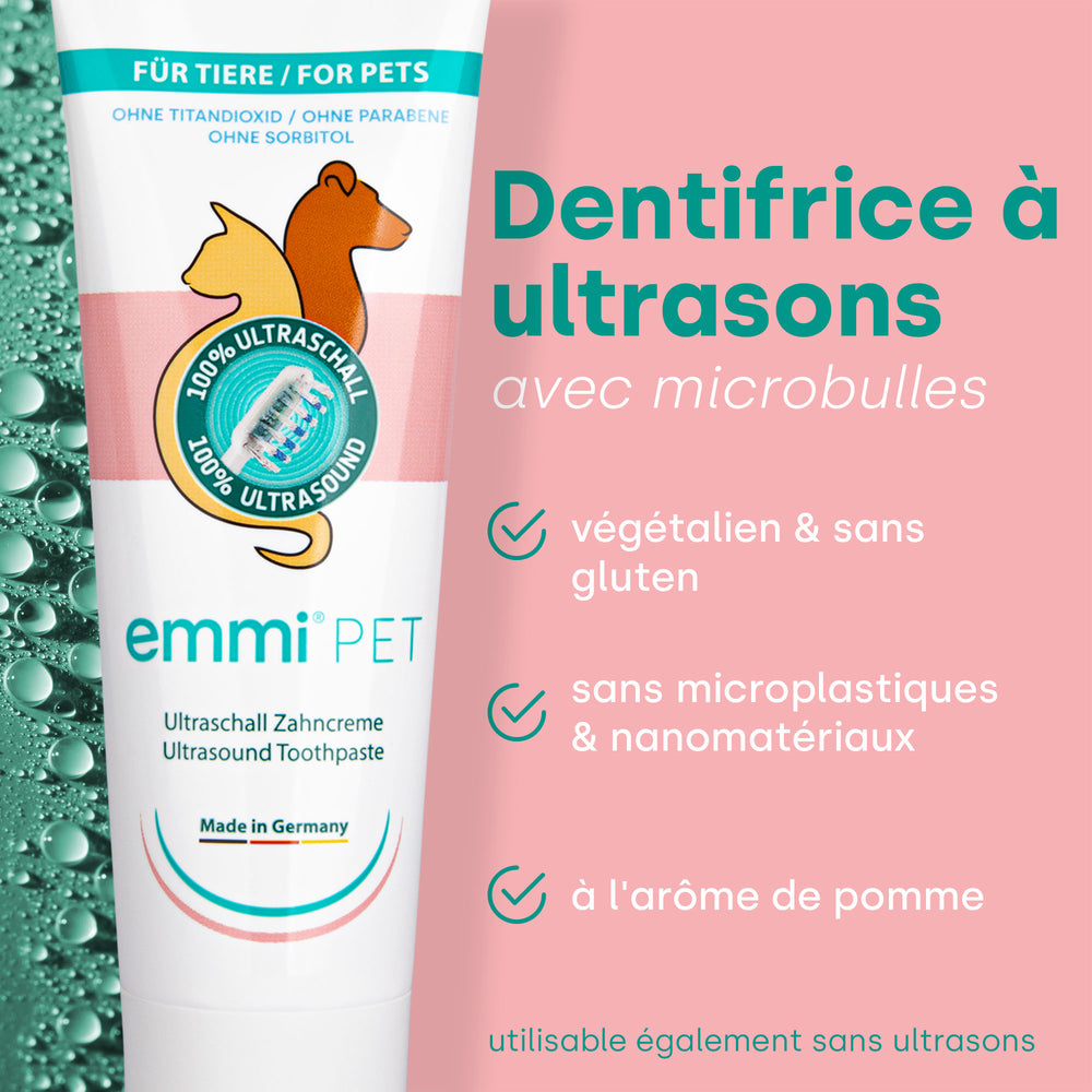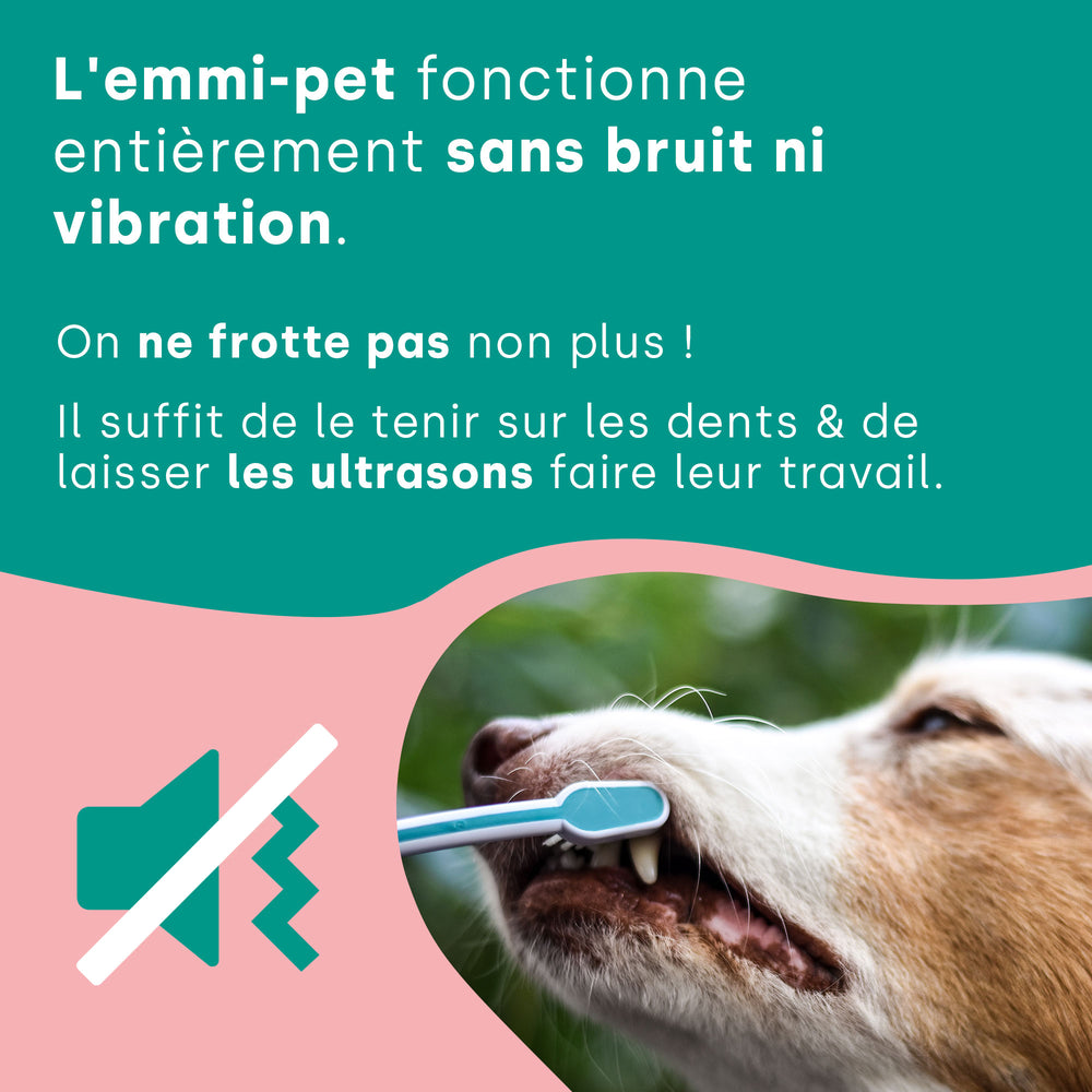 La brosse à dents à ultrasons Emmi Pet est une option douce et silencieuse pour les soins dentaires du chien.Grâce à la technologie des ultrasons, qui génère jusqu'à 96 millions de vibrations par minute, le brossage des dents est possible sans aucun frottement.