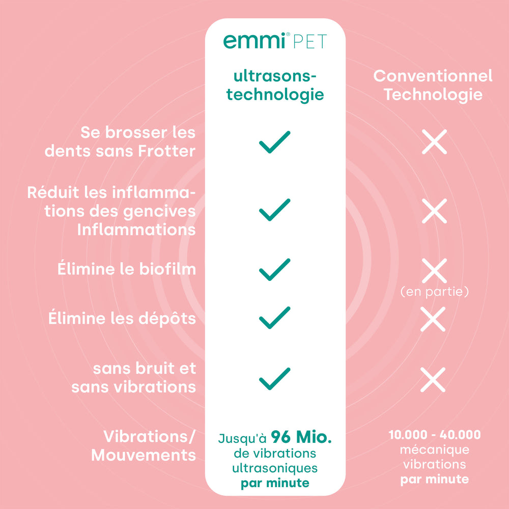 La technologie échographique unique du EMMI PET 2.0, avec jusqu'à 96 millions de vibrations échographiques par minute, offre un avantage significatif sur les méthodes de nettoyage dentaires conventionnelles.Cette innovation technologique permet de réduire doucement la plaque et de prévenir le tartre et de protéger les gencives et les zones sensibles de la bouche du chien.Dans cette fréquence, les ondes échographiques ne sont pas audibles pour le chien, ce qui rend Emmi-Pet 2.0 particulièrement adapté aux animaux.