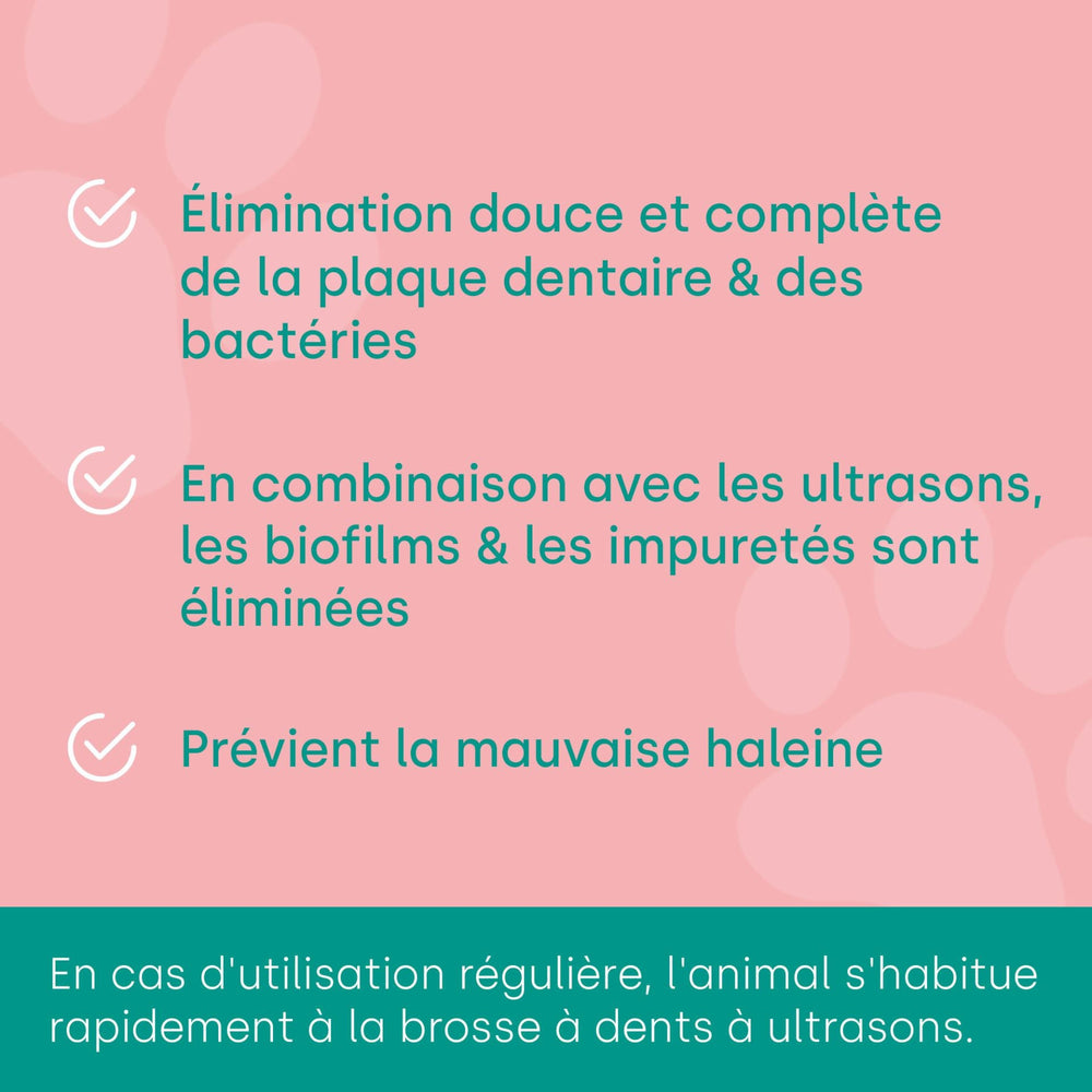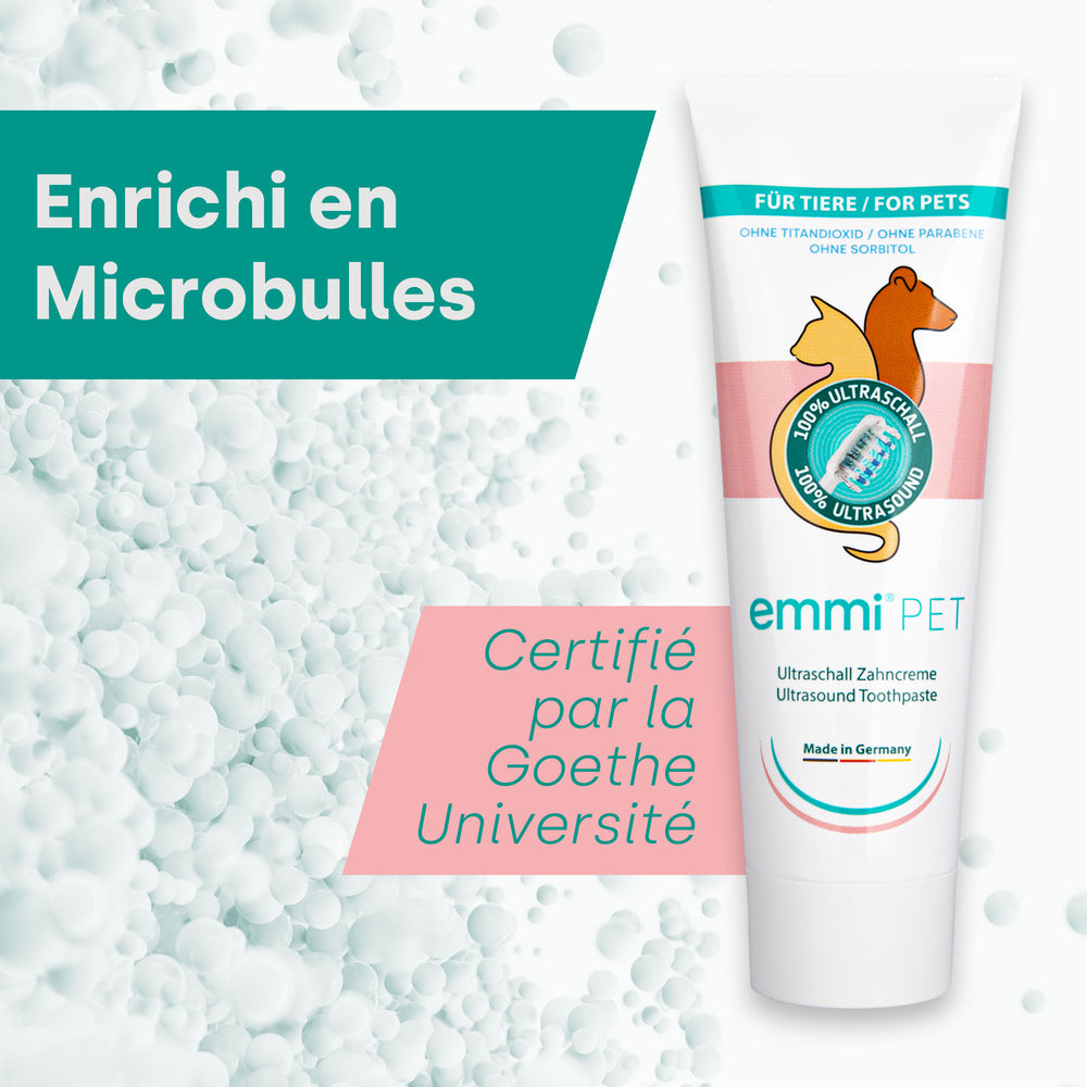 Le dentifrice à ultrasons emmi-pet pour animaux offre de nombreux avantages qui en font un excellent choix pour les soins dentaires de votre animal : Nettoyage doux sans abrasion : Grâce aux ultrasons, le brossage abrasif des dents n'est plus nécessaire. La valeur RDA (abrasion relative de la dentine) est de 0, ce qui signifie que le dentifrice est particulièrement doux pour l'émail et les gencives de votre animal. Élimination efficace des biofilms et des bactéries : la technologie des microbulles garantit que même la plaque dentaire et les bactéries tenaces sont éliminées sans exercer de contrainte mécanique sur les dents. Prévention des maladies des dents et des gencives : Un nettoyage doux mais approfondi préserve les fonctions protectrices naturelles des dents, réduisant ainsi considérablement le risque de maladies des dents et des gencives. Lutte contre la mauvaise haleine : L'utilisation régulière du dentifrice emmi-pet aide à prévenir la mauvaise haleine en réduisant le nombre de bactéries responsables des odeurs.