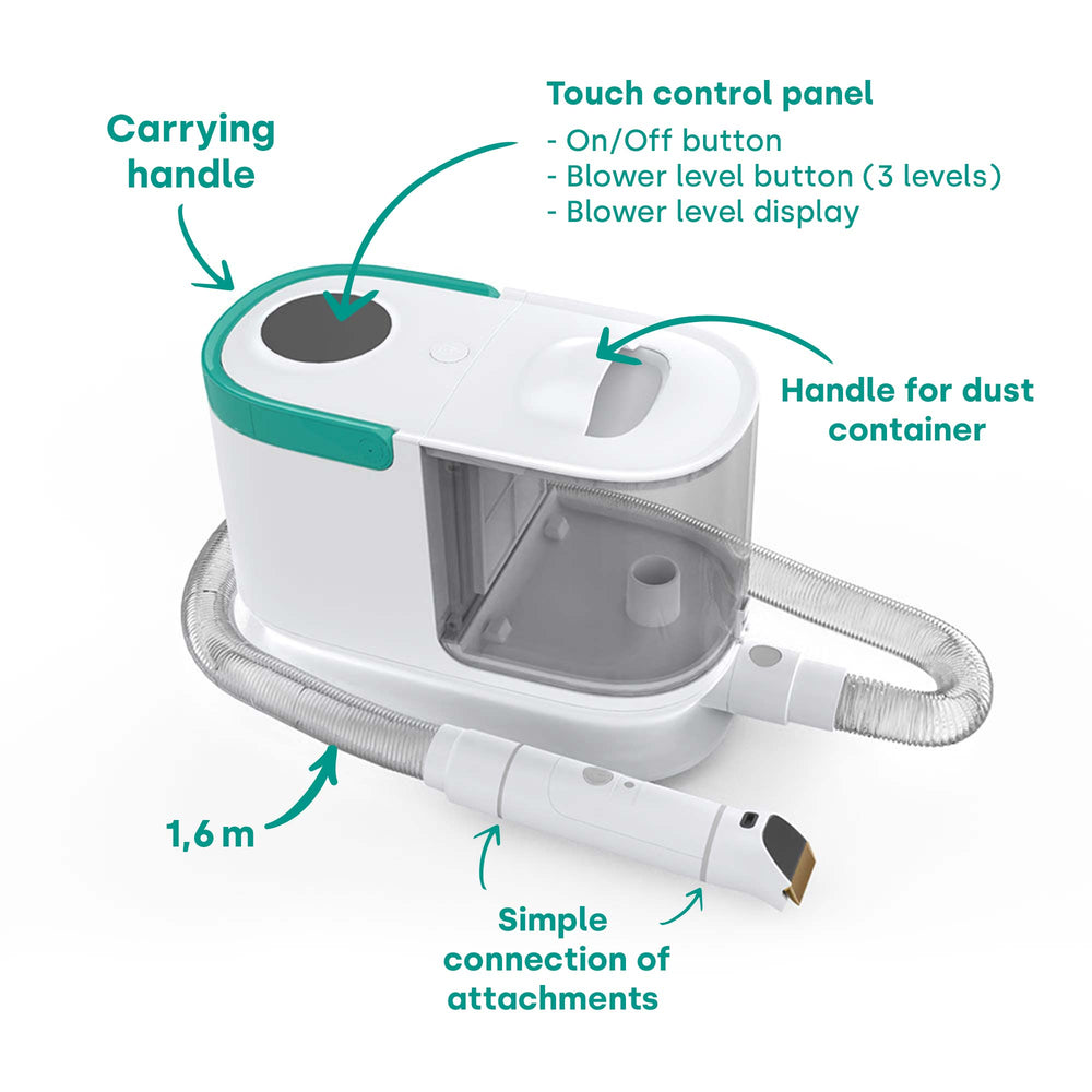 Le kit de toilettage comprend non seulement un aspirateur, mais également une tondeuse pour toiletter efficacement votre chien ou votre chat à la maison. Cela fait du kit de toilettage emmi-pet le meilleur aspirateur à poils d'animaux avec tondeuse par rapport aux autres modèles. Pour ceux qui ont besoin de soins encore plus complets, la version Pro propose également un coupe-ongles et une tondeuse à pattes spéciaux, idéaux pour un soin précis des pattes et des ongles.