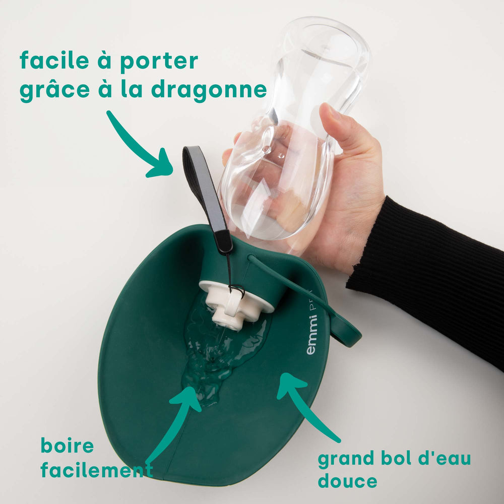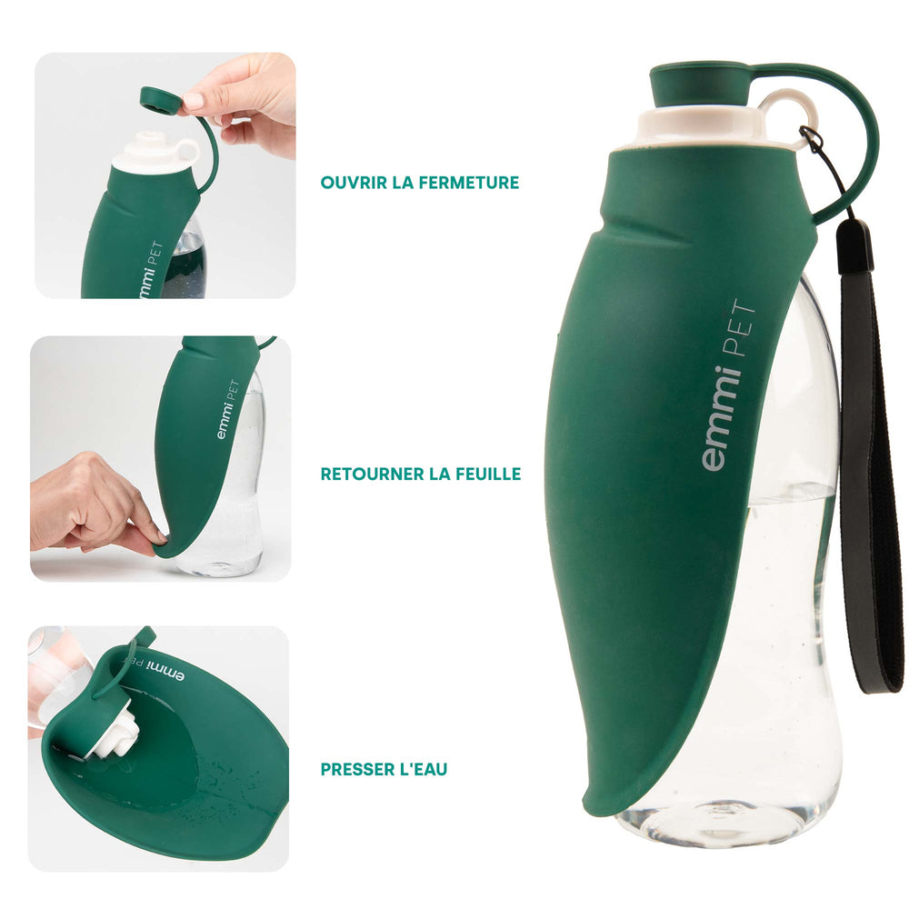Lorsqu'ils font de l'exercice ou par temps chaud, les chiens ont besoin de beaucoup d'eau. En voyage ou en promenade, il n'est parfois pas facile de fournir de l'eau fraîche à votre compagnon à quatre pattes. En chemin, il n'est pas surprenant que l'animal ait soif et boive dans des flaques d'eau ou des étangs. Mais l'eau peut contenir des germes et entraîner des problèmes digestifs. C'est pourquoi la gourde pour chien emmi-pet est la solution idéale pour les déplacements. Avec la bouteille d'eau de voyage, vous avez toujours beaucoup d'eau à portée de main.
