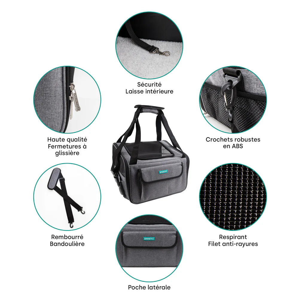 La haute qualité emmi-animal de compagnie Le sac de voyage Large est parfait pour transporter votre compagnon à quatre pattes en toute sécurité et confortablement. La cage de transport pour animaux de compagnie offre aux chiens et aux chats une sécurité maximale et répond à leurs besoins lors de courts trajets ou de longs trajets. Le tissu durable protège des influences extérieures et assure la stabilité de la cage pour chien. La surface hydrofuge permet d'essuyer facilement la saleté et la partie intérieure peut être facilement retirée et lavée. Le revêtement souple de l'intérieur assure le confort, tandis que les fenêtres d'aération assurent une circulation d'air optimale. Les poches et compartiments extérieurs offrent un grand espace de rangement pour les friandises, les jouets et autres articles pour votre animal de compagnie. Grâce à la bandoulière réglable, le sac de voyage pour chien peut être transporté sans effort.