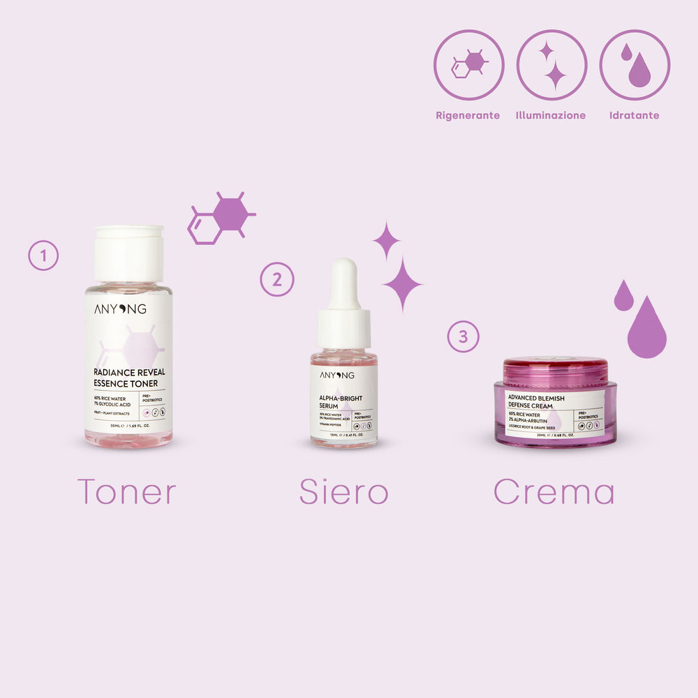 Il kit perfetto per una pelle uniforme. Il delicato tonico a base di acqua di riso purifica e restringe i pori, rendendoli ideali per i preliminari. Per una pelle uniforme, il prodotto di punta è il siero levigante e che riduce i pori. Il tocco finale è dato dalla ricca Advanced Blemish Defense Cream, un alleato indispensabile.