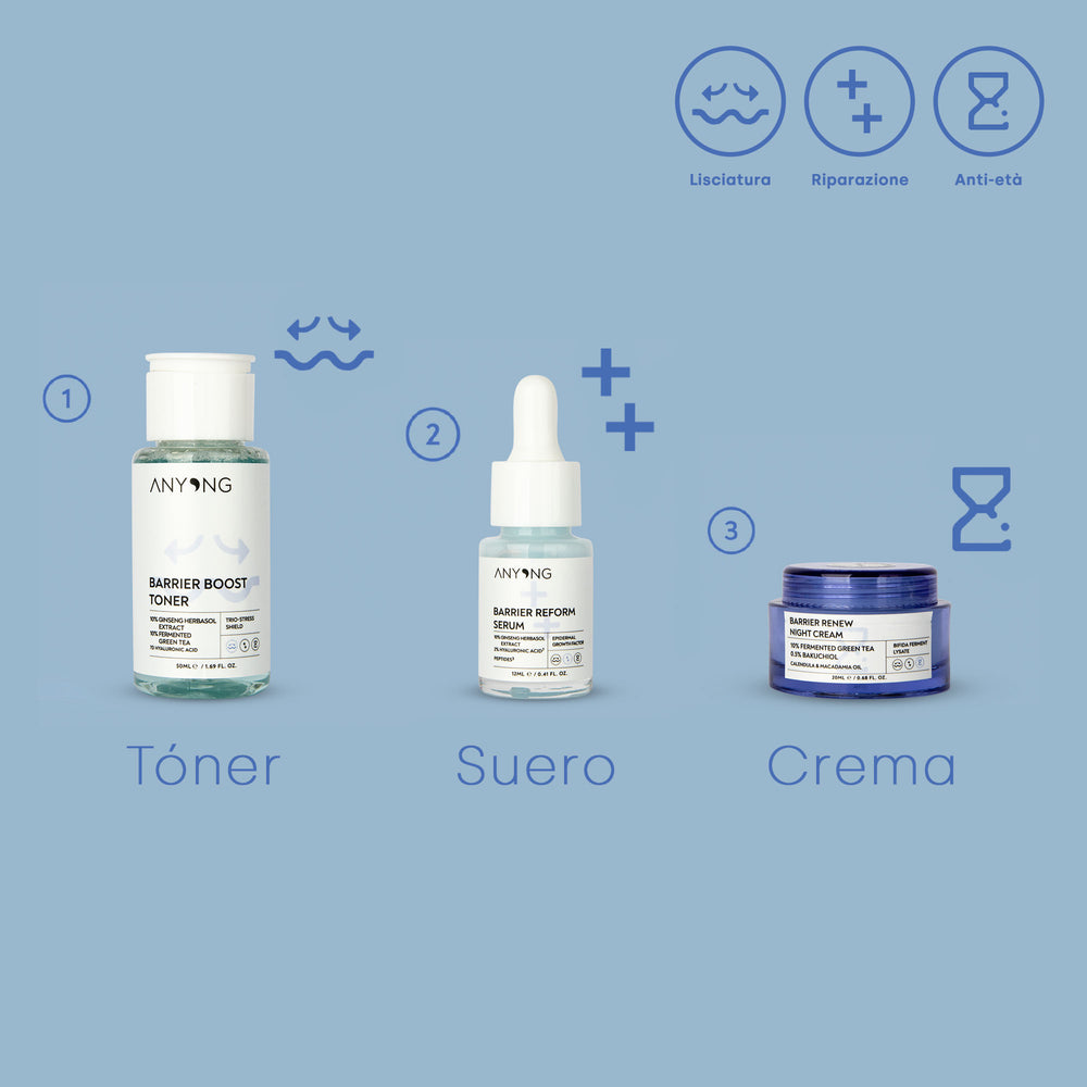 Il kit perfetto per riparare la barriera cutanea. Il tonico rassodante con ginseng e acido ialuronico fornisce alla pelle idratazione e vitamine, rendendolo il preliminare ideale. Il clou del trattamento riparatore è il siero all'acido ialuronico, che aiuta a ringiovanire la pelle grazie alla sua profonda pulizia. Il tocco finale è la crema da notte, che favorisce il rinnovamento delle cellule della pelle.