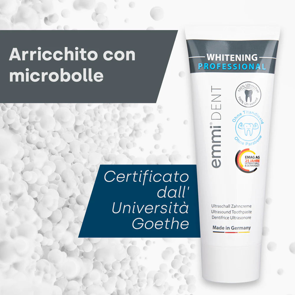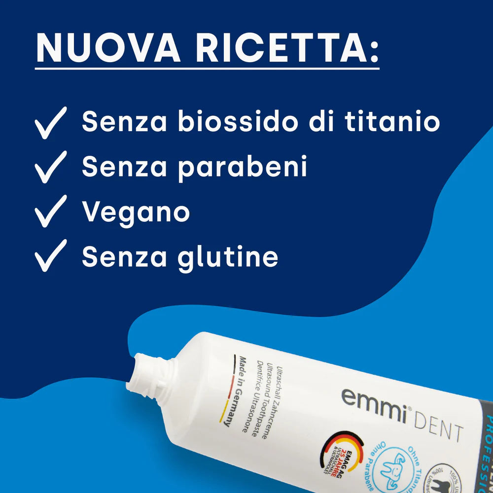 Affidati alla competenza di emmi-dent, leader mondiale nella cura dentale mediante ultrasuoni. Il nostro dentifricio sbiancante a ultrasuoni è stato sviluppato da esperti e clinicamente testato per offrirti qualità eccezionale e tecnologia innovativa. Metti la tua fiducia in emmi-dent e scopri la differenza!