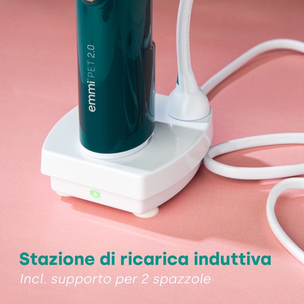 emmi-pet 2.0 è all'avanguardia nell'innovazione per la cura orale dei cani e coniuga comfort ed efficienza. Questo spazzolino ultrasonico per cani è stato appositamente progettato per offrire un'esperienza piacevole e senza stress sia per te come proprietario che per il tuo cane. Grazie al suo design intuitivo, potrai svolgere la pulizia quotidiana dei denti del tuo amico a quattro zampe in modo semplice ed efficace, indipendentemente dalla tua esperienza.