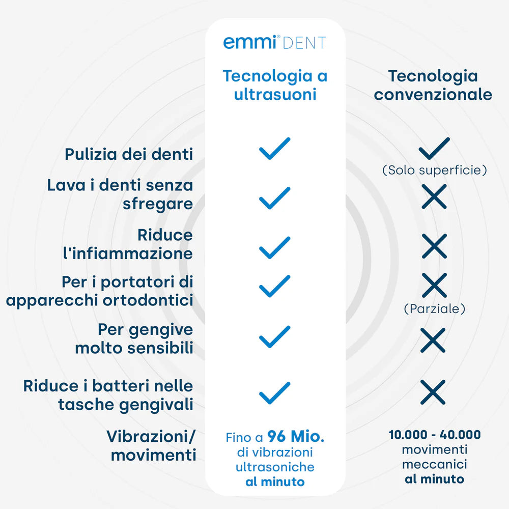 Per la prima volta nella storia dell'umanità, emmi-dent, È possibile lavarsi i denti senza movimenti meccanici! Invece di strofinare via il prezioso smalto dei denti, basta tenere la testina dello spazzolino sui denti e gli ultrasuoni faranno il resto per te. Denti sani e splendenti sono il risultato della nostra tecnologia brevettata a livello mondiale. L'applicazione senza abrasioni elimina qualsiasi danno ai denti, allo smalto e alle gengive.