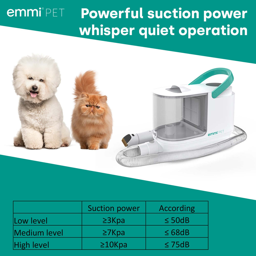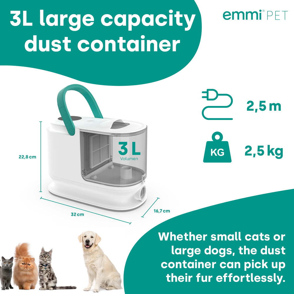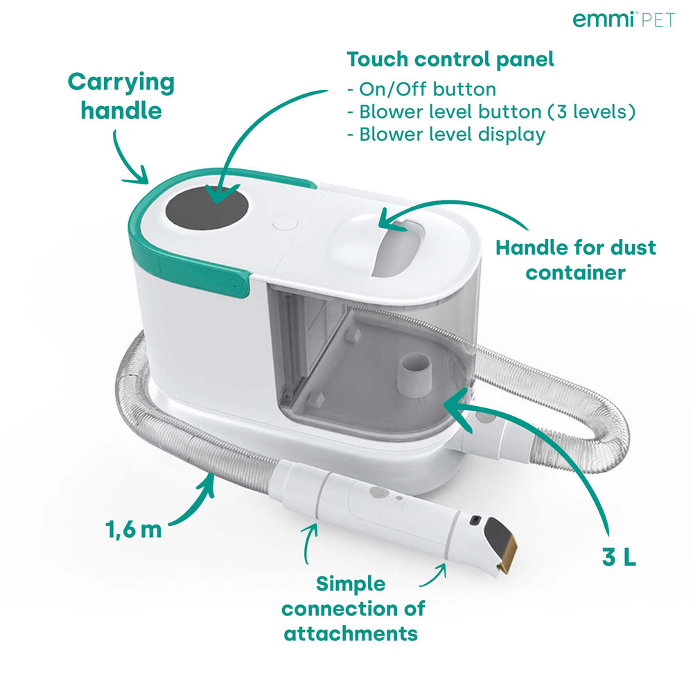 Mantenere la casa pulita può essere una sfida per i proprietari di animali domestici. I peli di animali sono onnipresenti sui tappeti, sui mobili e sui pavimenti duri. La soluzione? Il kit per la toelettatura emmi-pet combina un tagliacapelli, un pettine e un aspirapolvere per peli di animali in un unico dispositivo: un aspirapolvere senza sacchetto con tagliacapelli, sviluppato appositamente per le esigenze di cani e gatti, per rimuovere e tagliare in modo efficiente i peli degli animali e ridurre al minimo gli odori.